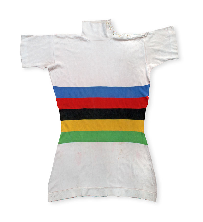 Nur der Weltmeister darf das Trikot mit den typischen Regenbogenfarben tragen, hier das Original-Dress von Toni Merkens.